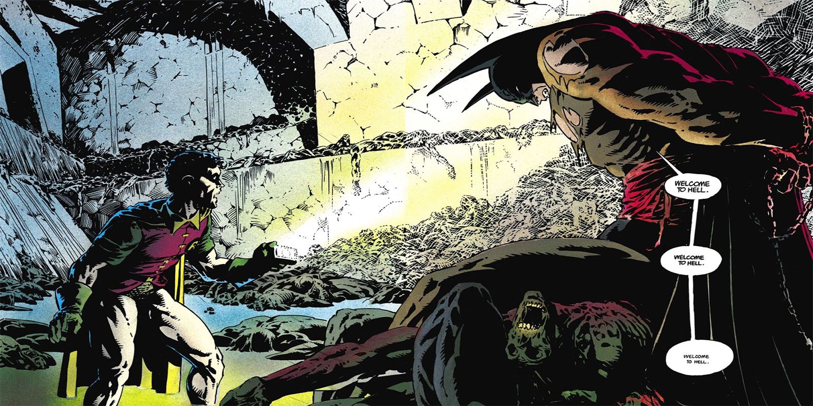 Esto nos introduce en algo parecido a la versión de DC de Hellraiser. Las encarnaciones malignas que escapan son muy cenobitas y el mundo oscuro del que provienen es un infierno aterrador. Esta historia nos trae algunas grandes imágenes oscuras del artista Greg Capullo. El escritor Scott Snyder es capaz de hacer converger todas las historias de Batman en las que había trabajado durante su época en Batman para darnos la historia definitiva de terror del Batman moderno.