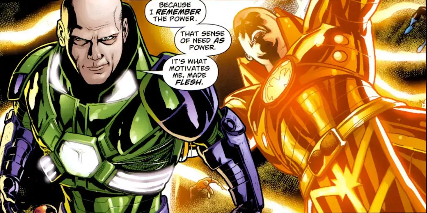 Lex Luthor ansía estatus, dinero y poder. Forjó Metrópolis en un imperio de su propio diseño. Entonces, un alienígena llegó y le robó el protagonismo, exponiendo a Luthor al mundo. Lex es egoísta, pero en ocasiones ha dejado de lado su ego para ayudar a la Liga de la Justicia a salvar el mundo. Ayudó a la Liga a curar el virus Amazo cuando era miembro del equipo, e incluso ayudó a los Linternas Verdes durante la Noche más negra.