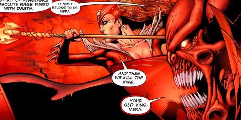 Mera es una guerrera feroz cuya furia no hizo más que crecer gracias a los Red Lantern Corps, y demostró ser una destructiva segunda al mando de Atrocitus. Mera se enfrentó enérgicamente a los Black Lanterns y acabó reuniéndose con un Aquaman resucitado, librándose del anillo rojo en el proceso.
