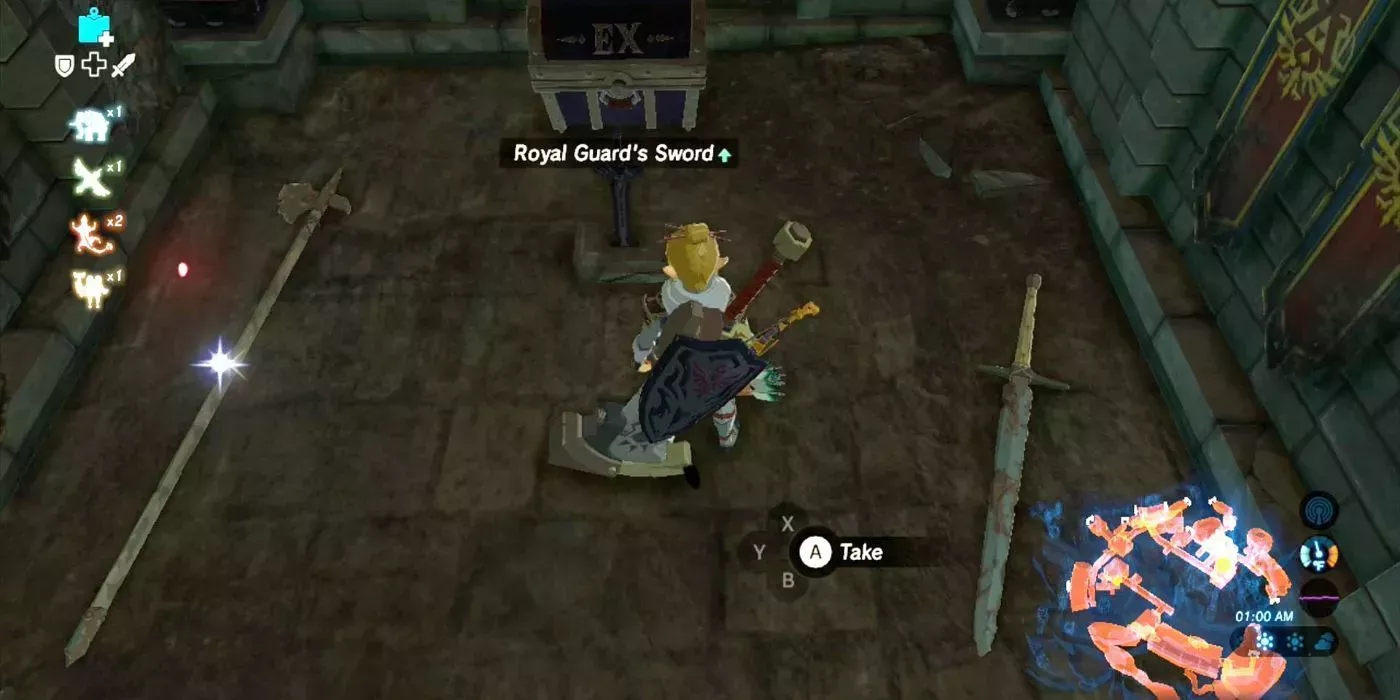 Algunas armas son empuñadas por monstruos, mientras que otras se pueden encontrar por sí solas, así que incluso un Link de bajo nivel puede escabullirse y hacerse con alguna de ellas. Parcy dará 300 rupias por cada una, así que esta búsqueda secundaria es una buena forma de ganar dinero. Además, es un incentivo para explorar las numerosas salas del castillo de Hyrule.
