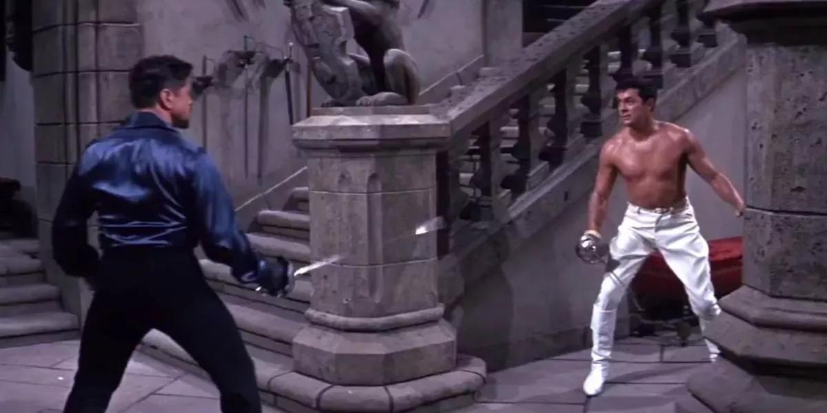 Aunque en 1940 todavía había demanda de dobles, muchas estrellas de las películas de capa y espada se entrenaban en esgrima y combate escénico y también hacían sus propias peleas. Este es un ejemplo de ese talento dinámico, ya que estas dos leyendas de la gran pantalla hacen alarde de su habilidad y se enfrentan a muerte. Tyrone interpreta a Don Diego Delavega/Zorro y Basil al capitán Esteban Pascale. En este combate, Don Diego hace el famoso truco de la vela momentos antes de que comience la pelea. Los combates en espacios reducidos y los desmarques expertos mantienen al público en vilo en todo momento, mientras el robusto juego de piernas mantiene el ritmo de la pelea como si fuera un baile flamenco. Es sencillamente maravilloso y, si la ubicación de la pelea no fuera tan limitada, estaría mejor clasificado.