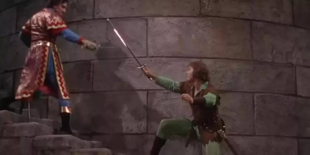 La escena de lucha de Las aventuras de Robin Hood, de 1938, tuvo eco hasta 1991, cuando Touchstone y Disney rodaron El cohetero y convirtieron a Neville Sinclair, el villano de la película, en una estrella de aventuras de Hollywood a la que se ve rodando una escena muy similar en una escalera idéntica. Ese mismo año, Steven Spielberg se inspiró cuando estrenó Hook y utilizó el épico duelo de Errol y Basil y las convenciones de rodaje como inspiración para la pelea definitiva de Pan y Hook.