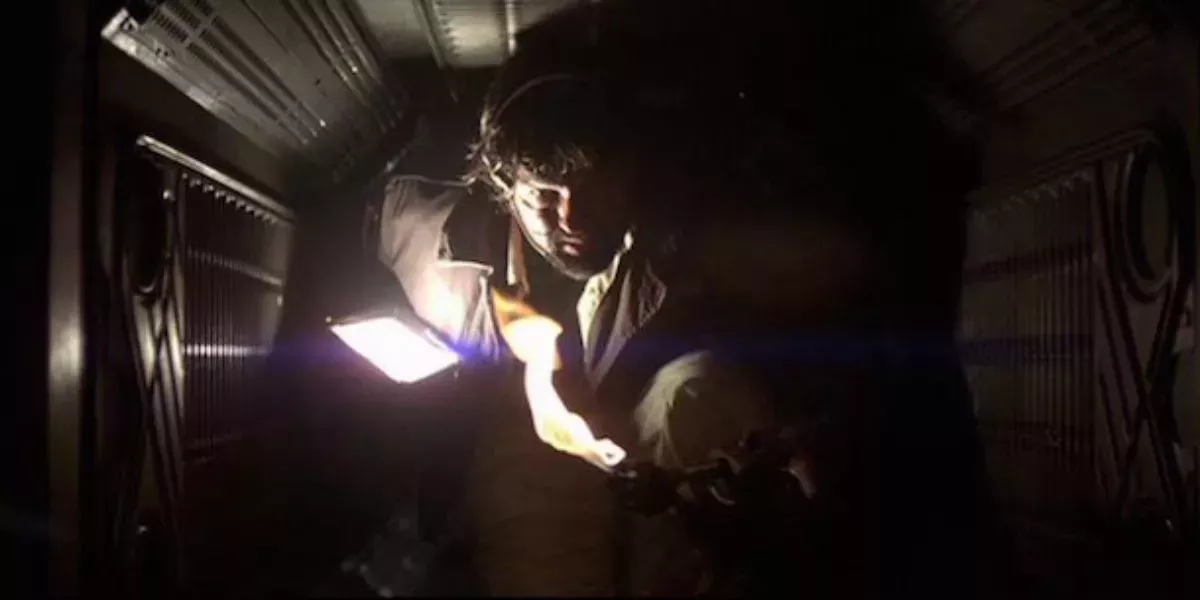 Dallas , compañero de tripulación, se arrastra por el conducto de aire para intentar atrapar al alienígena en una de las esclusas de la nave. La escena está completamente a oscuras, salvo por la luz de su soplete, que ilumina sólo lo suficiente su cara y las estrechas paredes del conducto de aire para que los espectadores sientan la presión. Dallas sólo puede confiar en las señales auditivas y en sus instintos hasta que lo tiene delante de sus narices. Los espectadores le ven descubrir residuos alienígenas justo cuando sus compañeros le dicen que han perdido el contacto, lo que significa que no pueden rastrear a Dallas ni al alienígena en el peor momento posible. Los compañeros gritan a Dallas que se mueva cuando lo ven venir hacia él cuando vuelven a tener contacto, pero es atrapado por el alienígena y es asesinado.