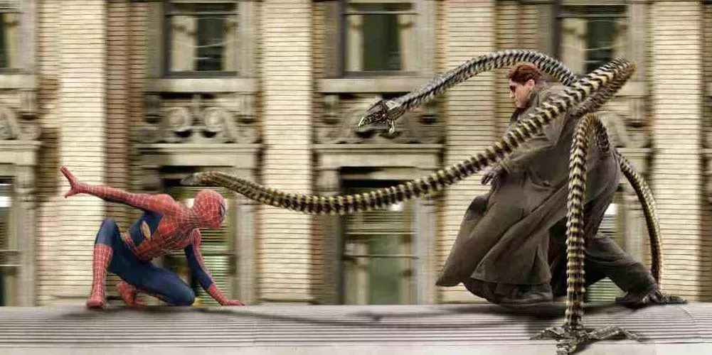Spider-Man 2 se centra en el doctor Otto Octavius (Alfred Molina), que luego se convierte en Doc Ock, un supervillano con apéndices mecánicos que ayudan a su fuerza y agilidad. A muchos críticos les gustó más esta película que la primera porque incluía más imágenes locas y humor patentados por Raimi junto a una historia profundamente personal.
