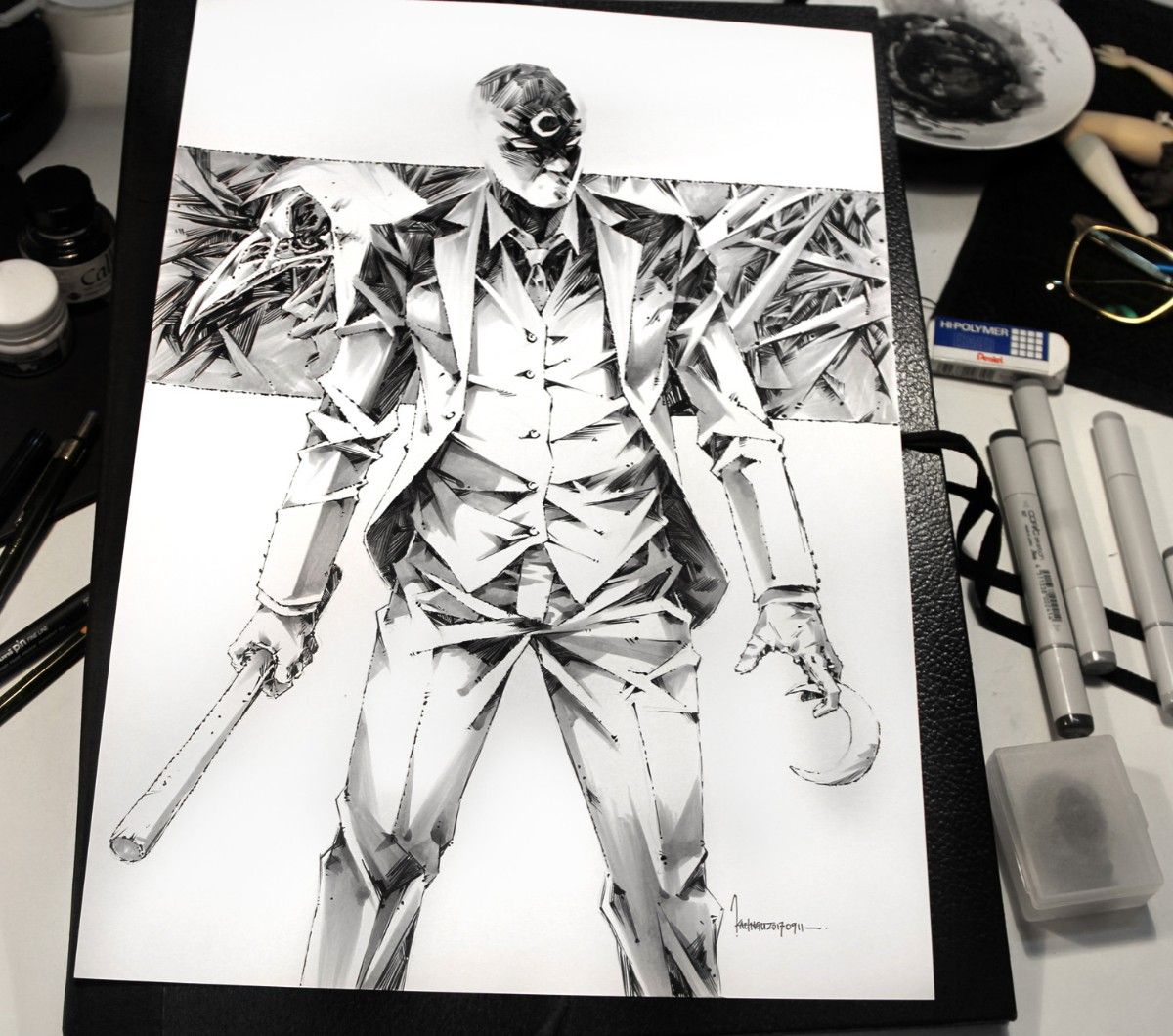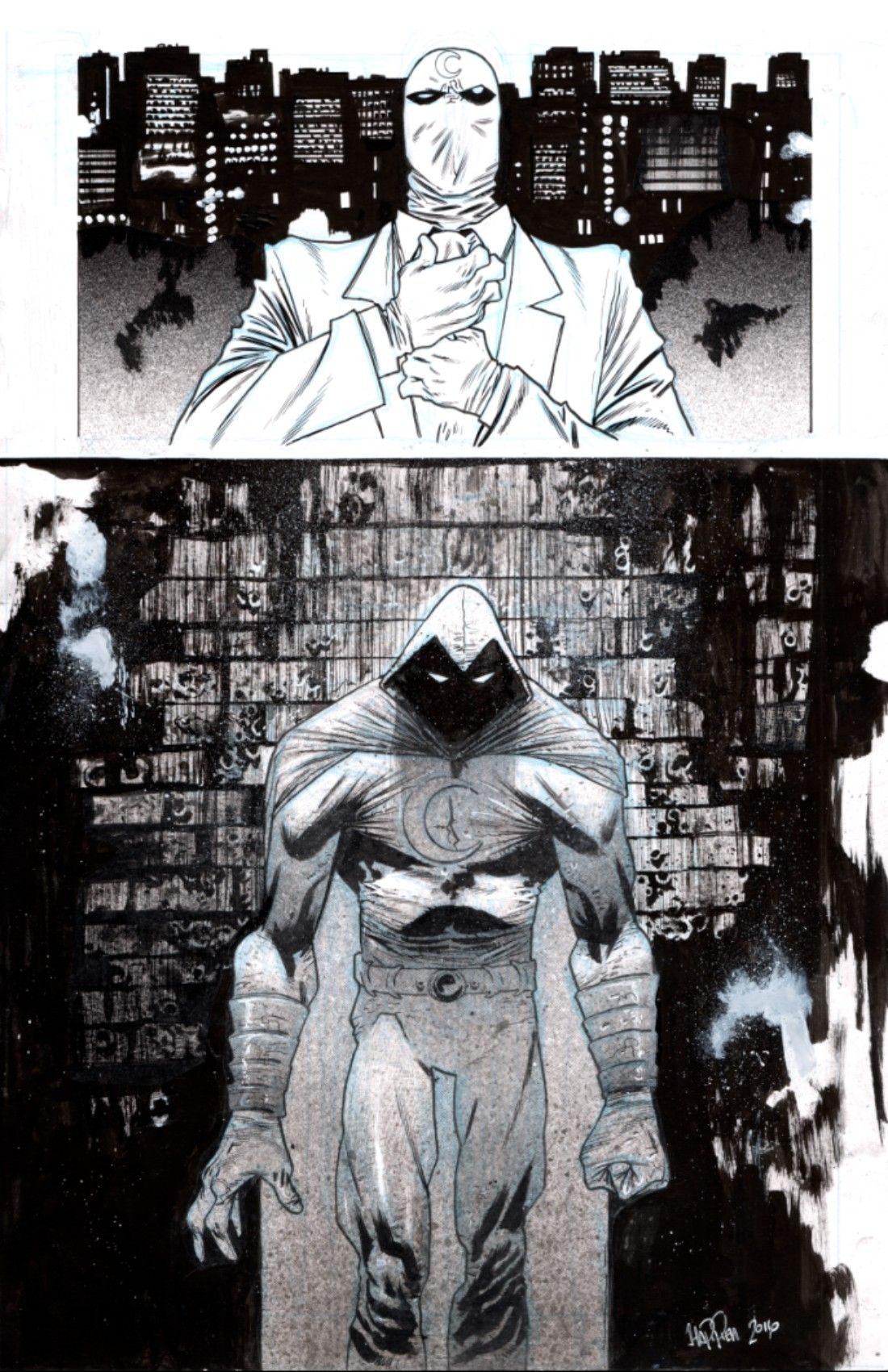 El artista Kael Ngu ha representado expertamente al Sr. Knight en toda su gloria monocromática, usando tinta para crear el efecto de "azabache y plata" usado por primera vez por Bill Sienkiewicz en el Caballero de la Luna #1 para hacer que la naturaleza opaca de su conjunto blanco tenga más complejidad.
