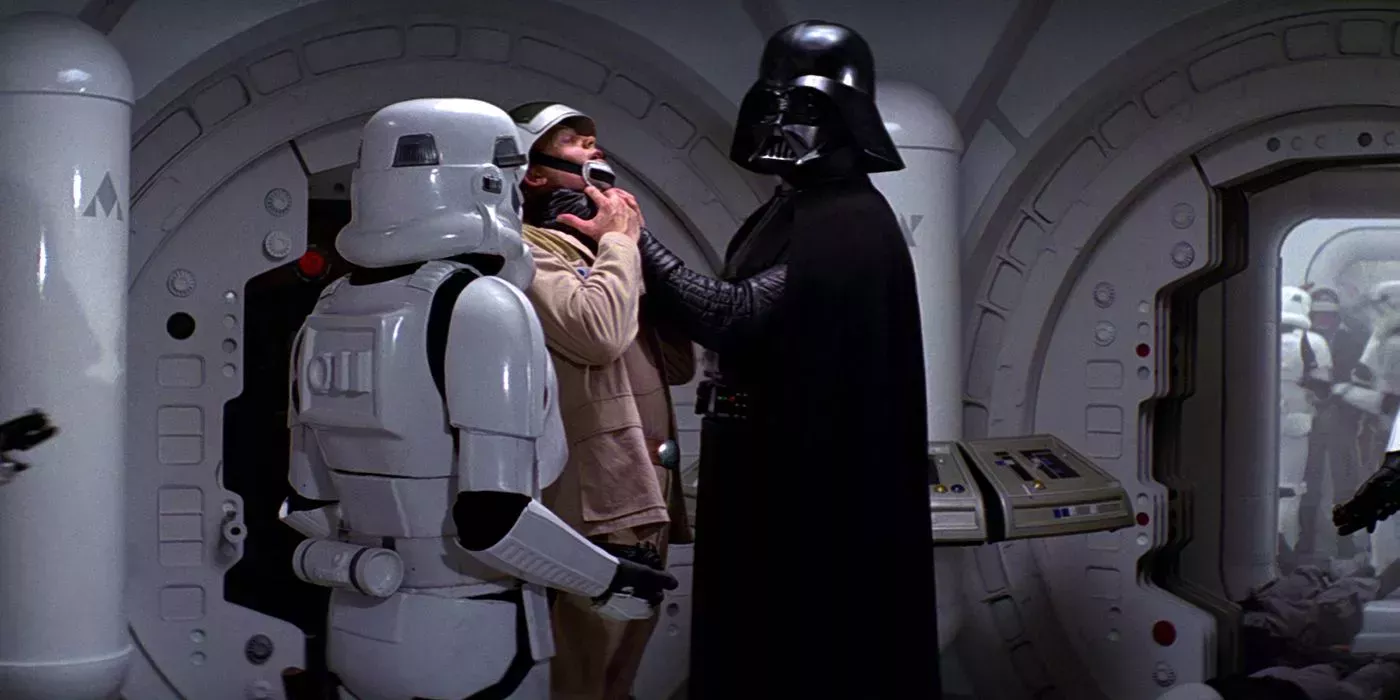 Darth Vader atravesó despreocupadamente un espeluznante pasillo lleno de cadáveres y luego pateó a los Rebeldes para encontrar los planos robados de la Estrella de la Muerte. Vader era claramente la persona más fuerte a bordo de esa nave, y su voz atronadora y su respiración metálica lo hacían diez veces más aterrador en el proceso.