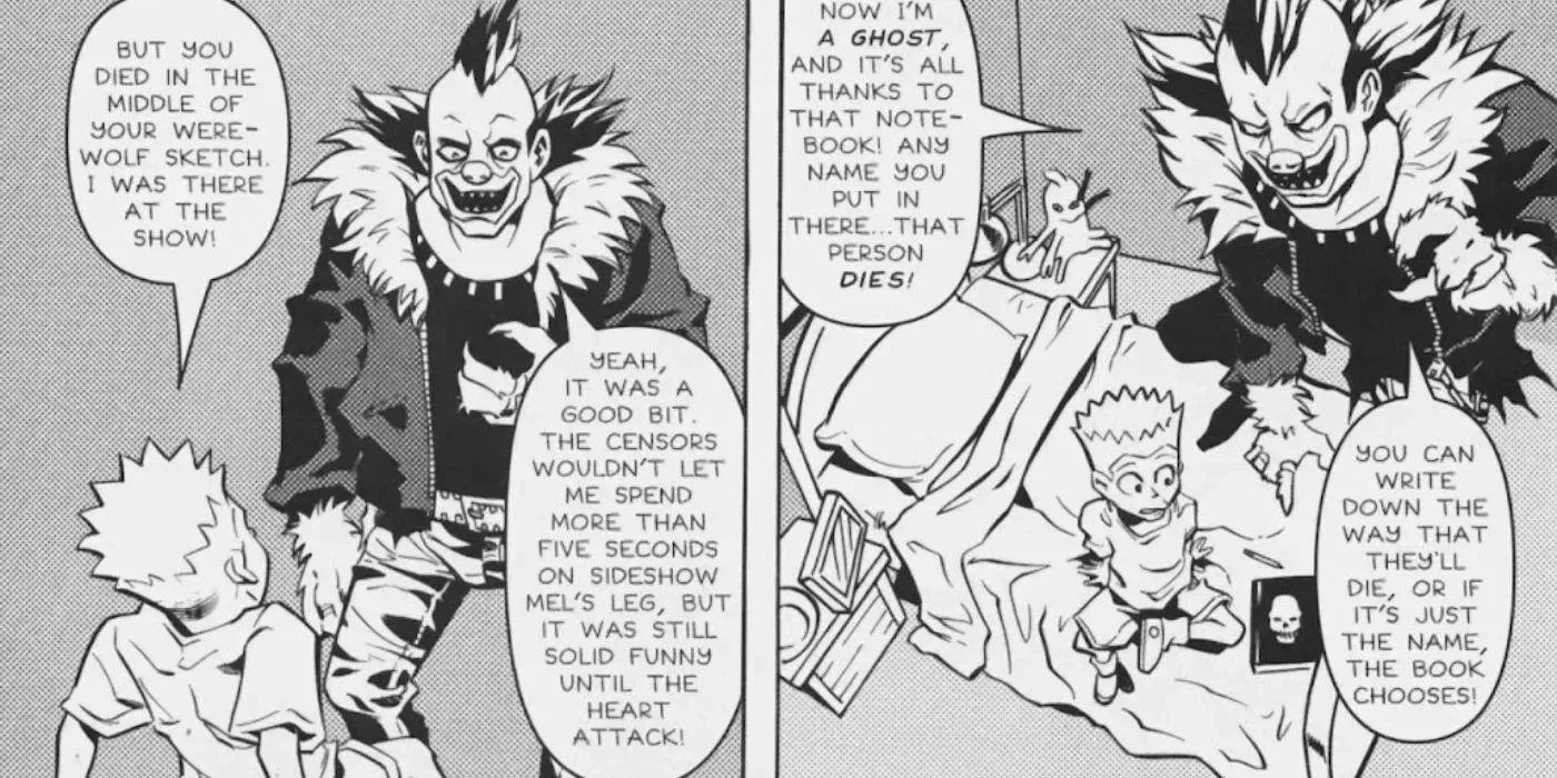 Death Note y Los Simpson no sólo van juntos en la animación. Antes de "Death Tome", los cómics de Los Simpsons ya habían parodiado el anime con la historia "Murder He Wrote". A diferencia de la versión animada, Bart es el análogo de Light, y Krusty hace las veces de Ryuk. "L" está preparada para ser Lisa, pero resulta ser Ralph, que simplemente no es bueno con las letras.