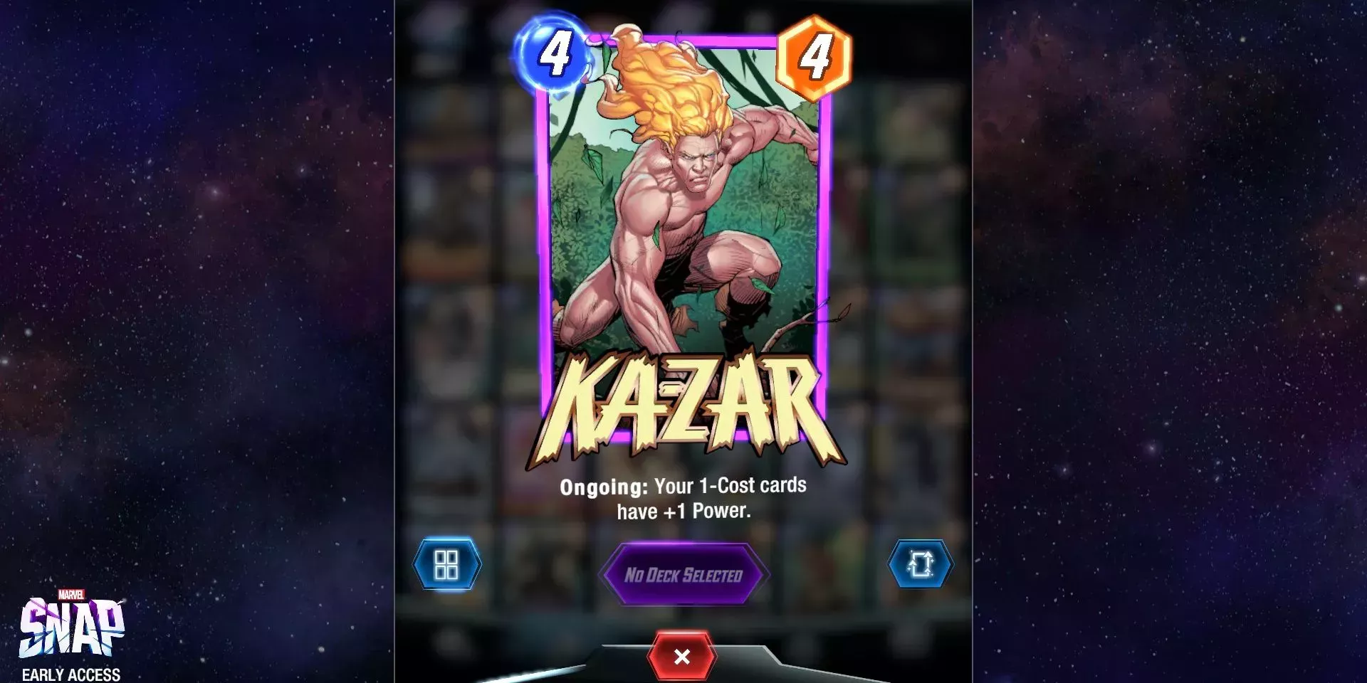 Puede que Ka-Zar no aparezca en el MCU, pero sin duda puede ser de gran utilidad en Marvel Snap. Con un coste de 4 energÃas, Ka-Zar es una carta de mitad y final de la partida que no solo aporta 4 energÃas, sino que mejora todas las cartas de coste 1 del usuario que ya han sido jugadas.