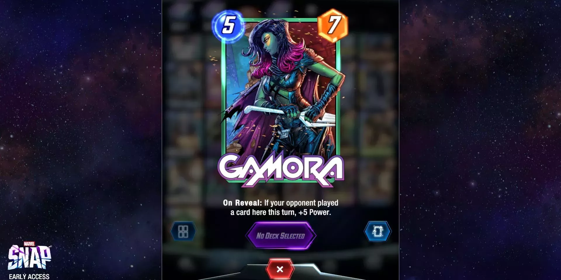 Para aquellos jugadores a los que les gusta utilizar a Rocket y Star-Lord desde el principio para conseguir Poder adicional por el simple hecho de predecir el movimiento del oponente, su compañera de equipo de losGuardianes de la Galaxia, Gamora, es potencialmente más devastadora. Gamora es cara, con 5 de energÃa, pero el coste merece la pena si el jugador la juega en el mismo lugar que el movimiento del oponente.