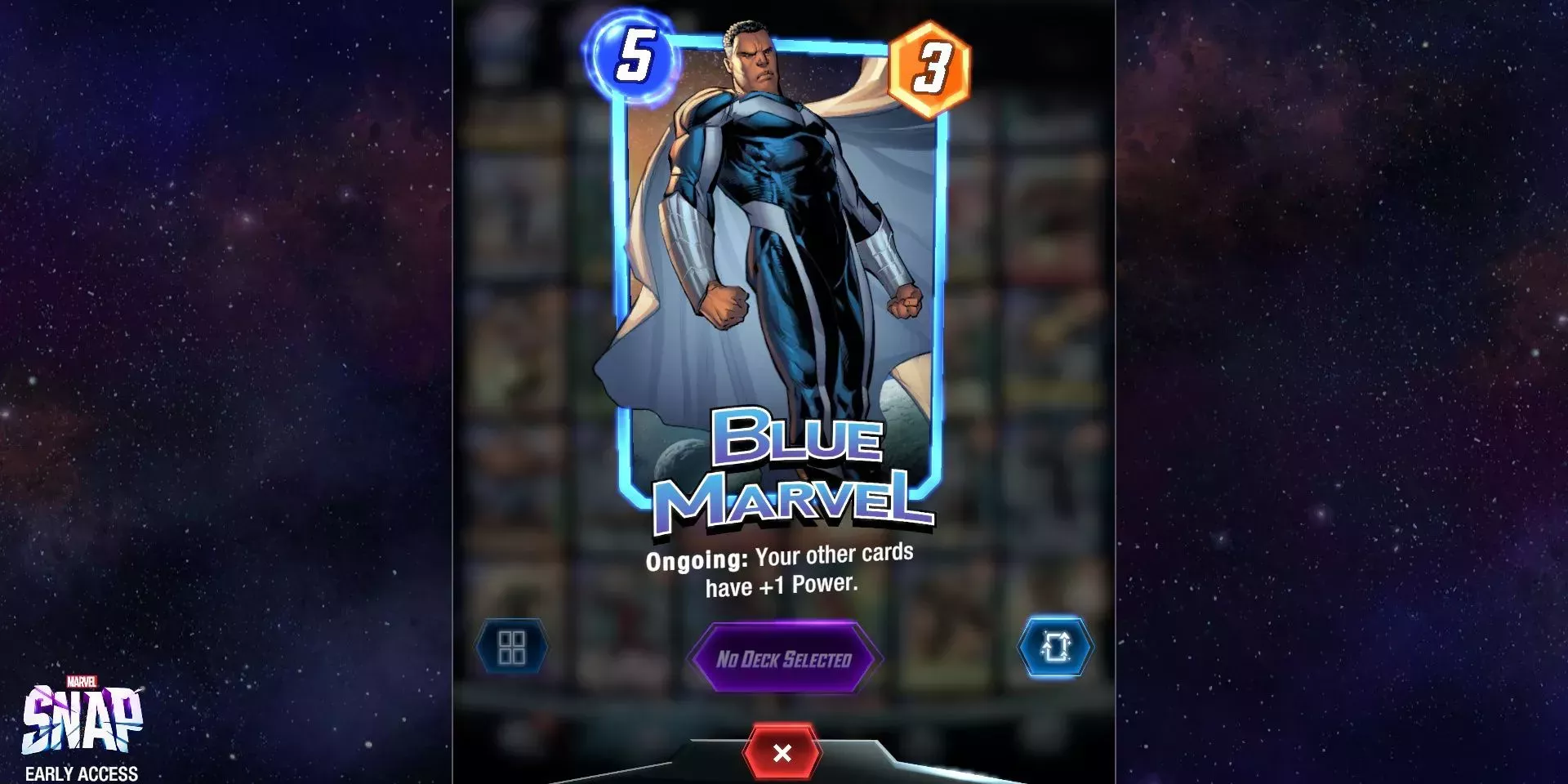 Ka-Zar tiene su valor al conceder a las cartas más baratas un poder extra y Ironheart puede apuntar a tres cartas con aumentos de +2, pero Blue Marvel puede subir la temperatura en las últimas rondas, dando +1 a todas las demás cartas aliadas. Maravilla Azul sólo tiene 3 de Poder, ya que cualquier otro más alto necesitarÃa ser nerfeado inmediatamente.
