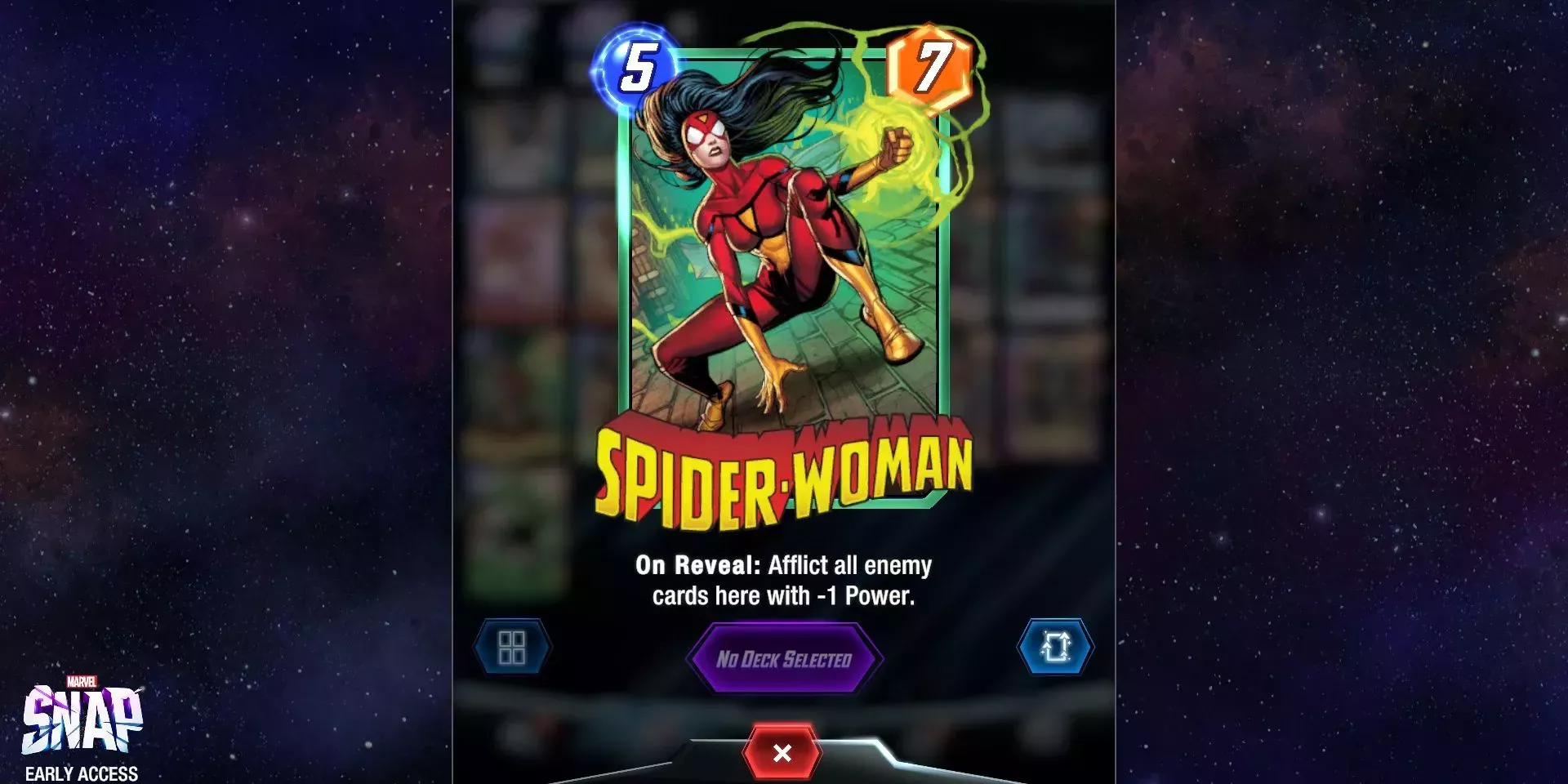 Jugar con Spider-Woman tiene el potencial de hacer subir de nivel a un lugar con un déficit de 11 Poderes, y eso lo dejarÃa listo para que una carta de 6 Costos le dé la victoria en la siguiente ronda. Incluso si su habilidad de Revelación es neutralizada o simplemente no es suficiente, el Poder base que proporciona puede llegar muy lejos.