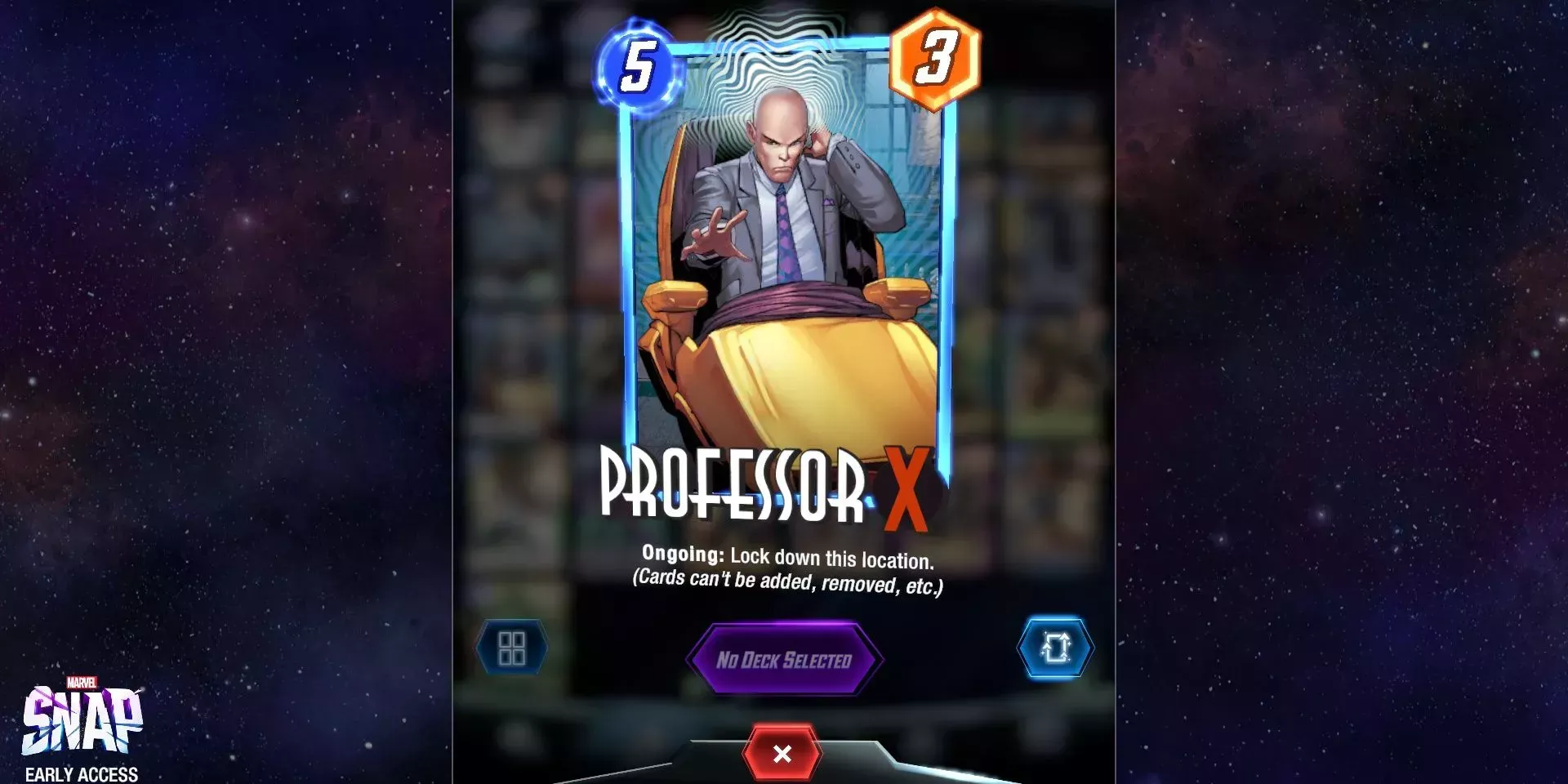 La habilidad del Profesor X bloquea el lugar donde se juega la carta, lo que significa que no se pueden añadir ni quitar cartas. Si se juega en el momento adecuado, el bloqueo puede proteger una ventaja, permitiendo al usuario centrarse en otras localizaciones, lo que podrÃa resultar muy valioso de cara a la ronda final. TodavÃa se puede conferir poder a esa ubicación a través de personajes como Mister Fantastic o Blue Marvel, pero impedir que las cartas se muevan allà podrÃa ser crucial.