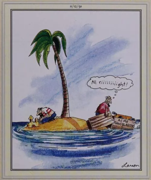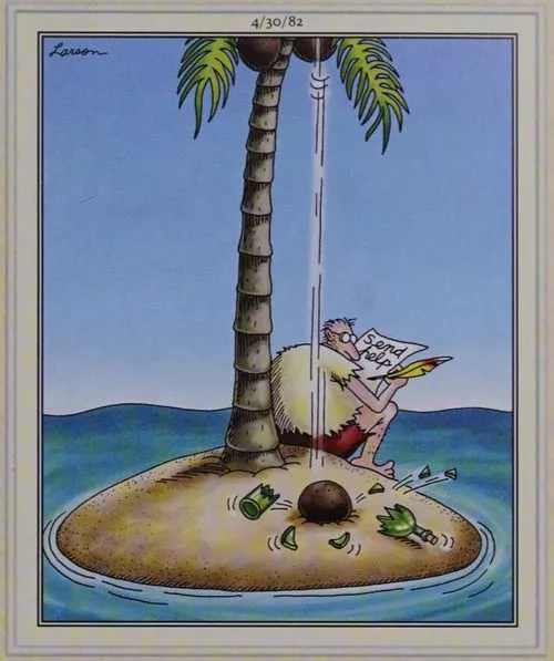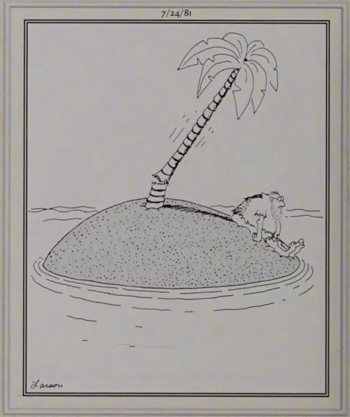 Es fácil quedar varado en el universo de The Far Side. Esta teorÃa se evidencia por las numerosas personas aisladas que Larson retrata. Debe haber una abundancia de pequeñas islas aisladas, ya que ese es el destino de muchas almas desafortunadas cuya mala suerte produce diversión para los lectores.