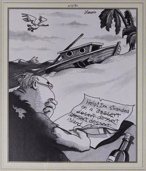 Hay algunas palabras en inglés que son fáciles de confundir. Una persona varada en The Far Side se encuentra con una de estas palabras tramposas cuando intenta escribir una carta pidiendo ayuda. Dado que "desert" y "dessert" son similares, elegir la correcta puede ser difÃcil. Después de múltiples errores y correcciones, aún usa la ortografÃa incorrecta.