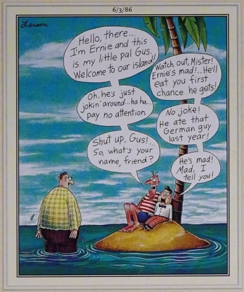 Hay otra persona varada en The Far Side cuya suerte es mucho peor que la del hombre que perdió su botella. A diferencia de la tira anterior, se requieren muy pocos detalles para expresar el gag de esta divertida cómica. Una mirada a la situación es suficiente para que un amplio público entienda la comedia. Aunque el chiste puede disfrutarse en un breve perÃodo, las reflexiones que suscita pueden llevar más tiempo en contemplarse.
