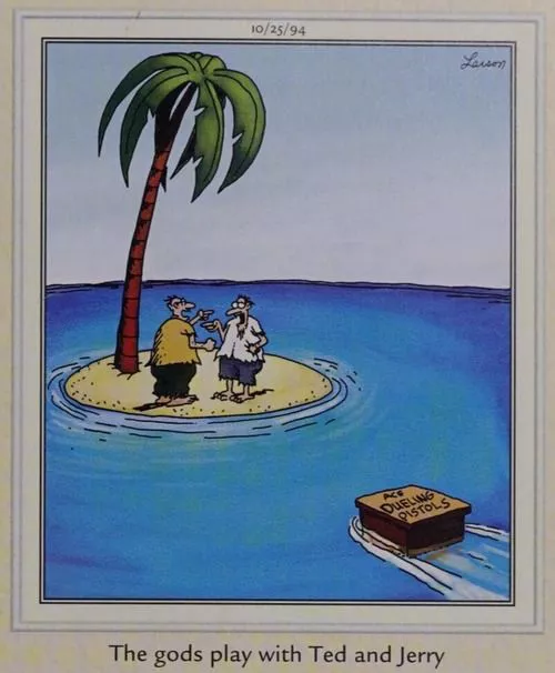 Acabar varado en una pequeña isla con un compañero podrÃa resultar útil para la conversación y prevenir la soledad. Por supuesto, también hay desventajas, como las discusiones. Un inconveniente que Ted y Jerry de The Far Side conocen bien. Con un par de pistolas desafiantes a la deriva hacia ellos, la ya grave situación de los dos individuos perdidos está a punto de empeorar.