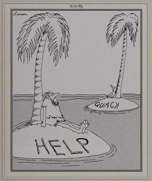 Muchas cosas extrañas ocurren en The Far Side, incluyendo áreas remotas como islas. Otro de los muchos individuos varados de este mundo es testigo de uno de estos extraños eventos. El hombre atrapado se sienta junto a un cartel de ayuda cuando mira hacia el agua. En una isla cercana, un pato se sienta junto a un cartel similar. Tanto el hombre aislado como el lector quedan llenos de numerosas preguntas.