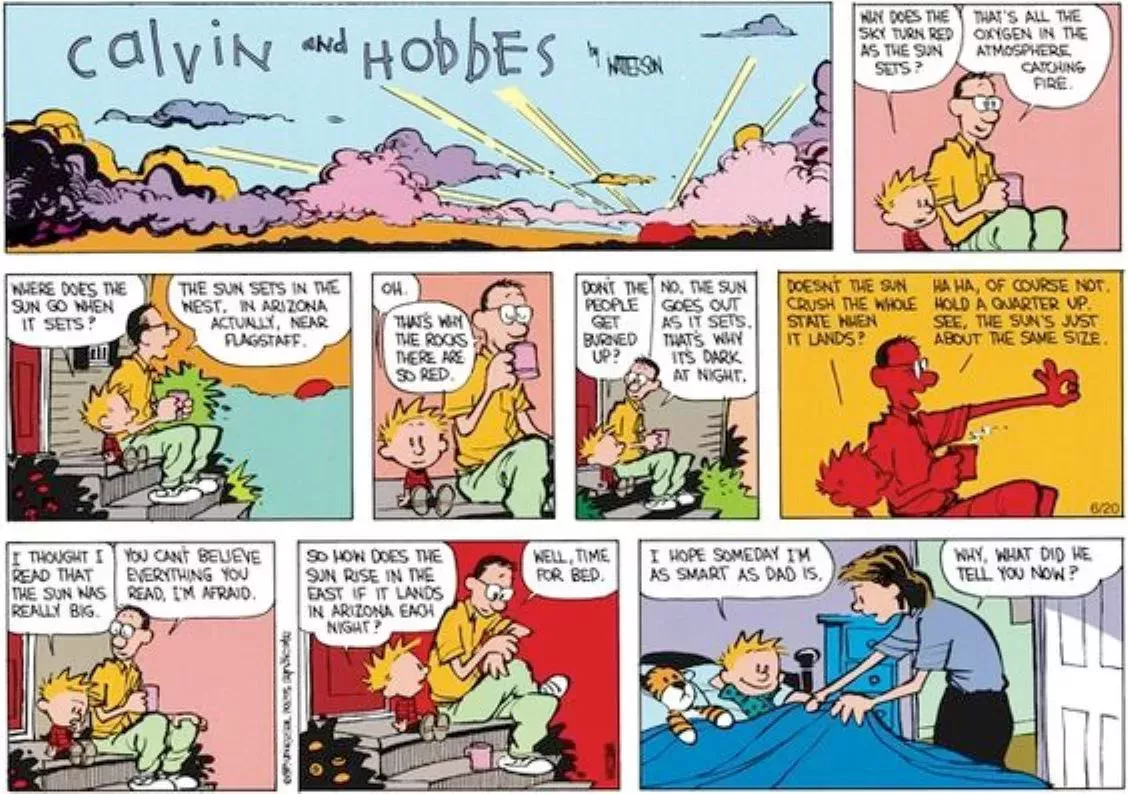 Aunque pueda parecer un poco malintencionado, no hay nada más divertido que ver al padre de Calvin difundiendo información errónea. En esta tira, el padre de Calvin se sienta junto a su hijo y miente sobre el tamaño y el movimiento del sol en el cielo. Es una tira divertidísima que mejora con el contexto.