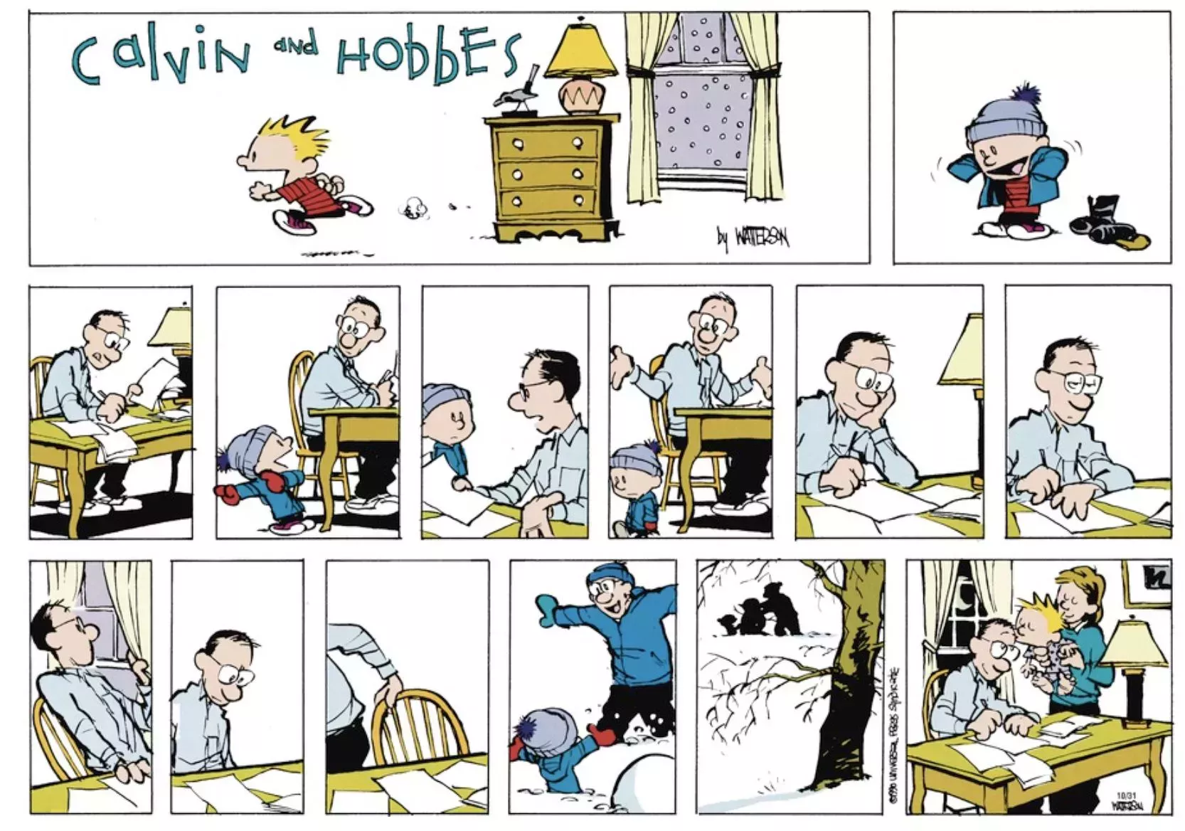 No todas las tiras de Calvin y Hobbes necesitan diálogos. Algunas de las mejores tiras simplemente implican a Bill Watterson mostrando su talento para la narración visual. En una tira que evoca "Cat's in the Cradle" de Harry Chapin, Calvin se acerca a su padre para pedirle que salgan a jugar juntos a la nieve. Al principio, el padre de Calvin se niega, pero finalmente abandona su trabajo y sale a jugar con su hijo.