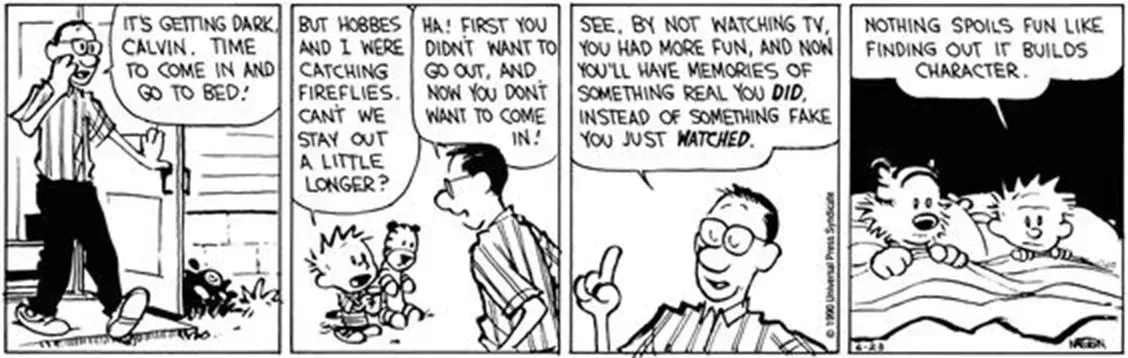Querer quedarse fuera hasta más tarde es la esencia del verano infantil, y eso es exactamente lo que el padre de Calvin reconoce sobre la reticencia de su hijo a irse a la cama. Al intentar mostrar a Calvin por qué es importante, consigue transmitir sus valores al niño de seis años, pero Calvin no aprecia sus esfuerzos. Es un agudo recordatorio de las formas en que las lecciones pueden transmitirse a los niños y de lo molesto que puede ser recibir un "te lo digo".