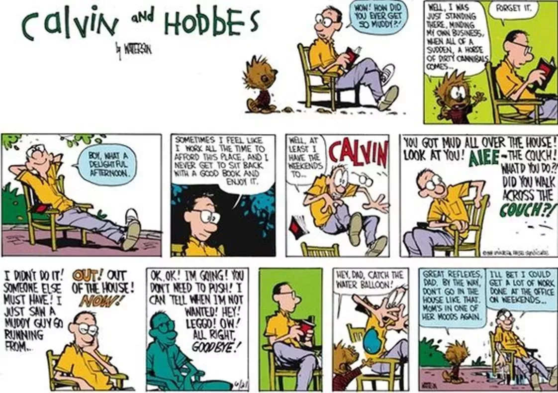 Con el padre de Calvin intentando disfrutar de un día de verano, Calvin se acerca cubierto de barro, antes de salir corriendo hacia su madre, de alguna manera arrastrando barro por el sofá en el proceso. Todo termina con el padre de Calvin salpicado por un globo de agua sorpresa y reprendido por su lentitud de reflejos. Es divertidísimo y presenta una nueva faceta de las travesuras de Calvin. También muestra por qué su padre se cansa del caos constante de Calvin.