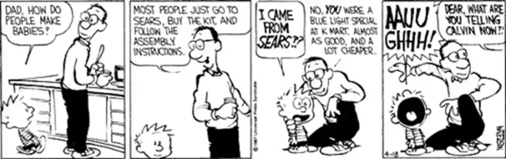 Uno de los mejores momentos del padre de Calvin se inspiró en la clásica pregunta infantil: ¿de dónde vienen los bebés? En lugar de hacer esperar a Calvin unos años para averiguarlo o hablarle de la cigüeña, el padre de Calvin le tomó el pelo con información errónea. Le dijo a Calvin que la mayoría de los niños vienen de Sears, pero que Calvin venía de Kmart.