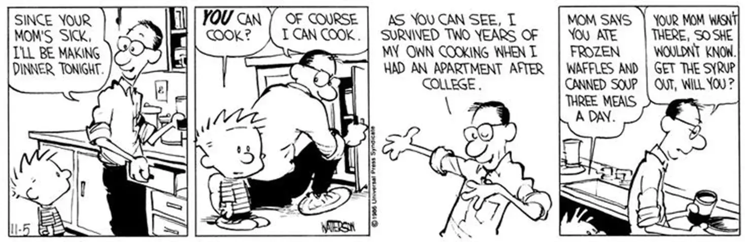 El hecho de que el padre de Calvin sea un pésimo cocinero parece acorde con el personaje, aunque es curioso que también le guste hacer barbacoas al aire libre. Añade una capa extra a casi todos los chistes sobre comida que aparecen más adelante en la tira. También pone de relieve la cocina de la madre de Calvin, ya que la alternativa son gofres congelados y sopa enlatada.