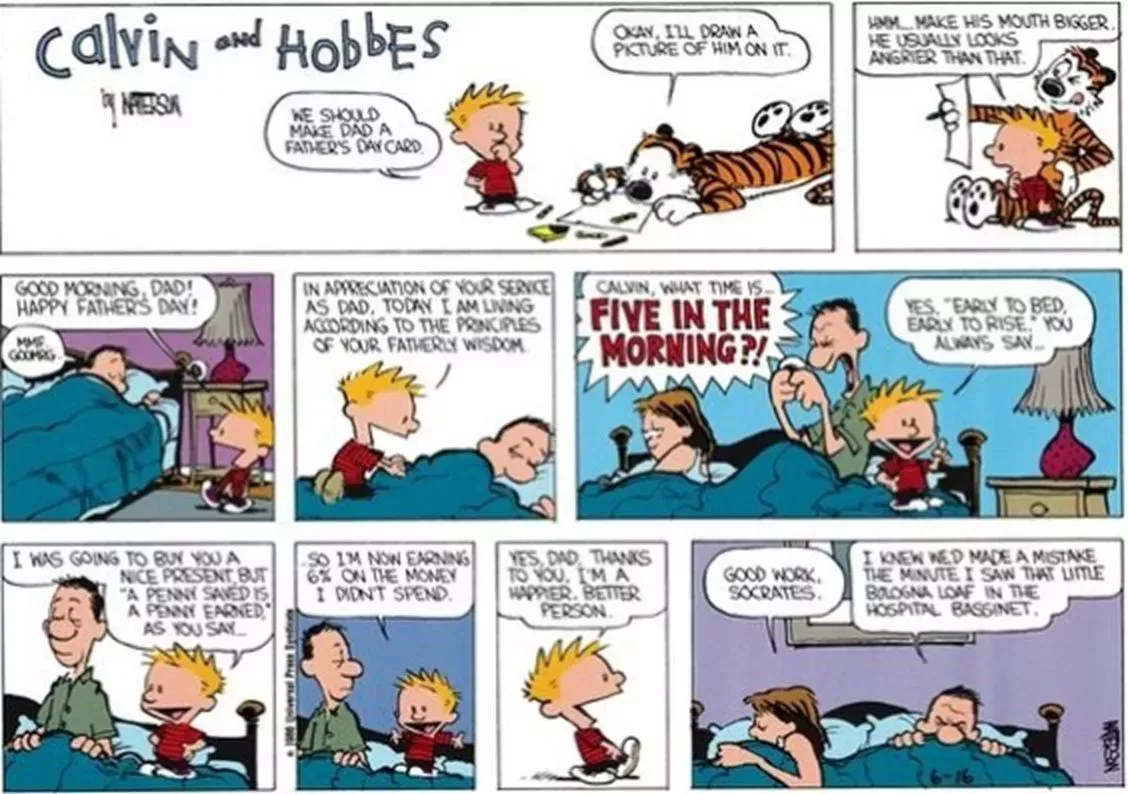 Dar lecciones de vida a los hijos es el deber de un padre, pero no siempre acaba bien. Por mucho que el padre de Calvin intente forjar el carácter de su hijo, nunca sale como él había planeado. La tira del Día del Padre de Calvin y Hobbes es un ejemplo más de este problema.
