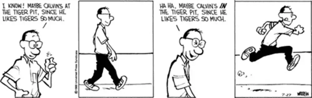 Cuando Calvin desapareció, su padre dejó a su madre esperando a su hijo, mientras él buscaba en el zoo para encontrarlo. Empezó despacio y con cuidado, sabiendo que su revoltoso hijo probablemente estaba a salvo. Sin embargo, en cuanto se dio cuenta de que a Calvin le gustaban los tigres, corrió hacia el foso de los tigres, aterrorizado por lo que el niño pudiera hacer por sí solo. Es una muestra de su amor por Calvin, pero también demuestra hasta qué punto Calvin es una amenaza y hasta qué punto su padre le comprende. Más que una simple broma, la tira también hace que el padre de Calvin parezca una persona realista con preocupaciones y miedos genuinos.