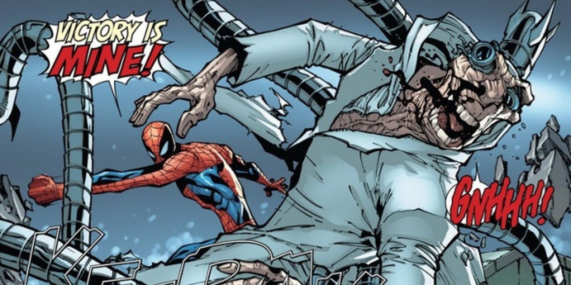 Spiderman pasó sus últimos días de vida jadeando por aire en el cuerpo descompuesto de Dock Ock antes de ser esencialmente golpeado hasta la muerte por sus propios puños. Es todo muy "Invasión de los ladrones de cuerpos" y es profundamente inquietante de leer.
