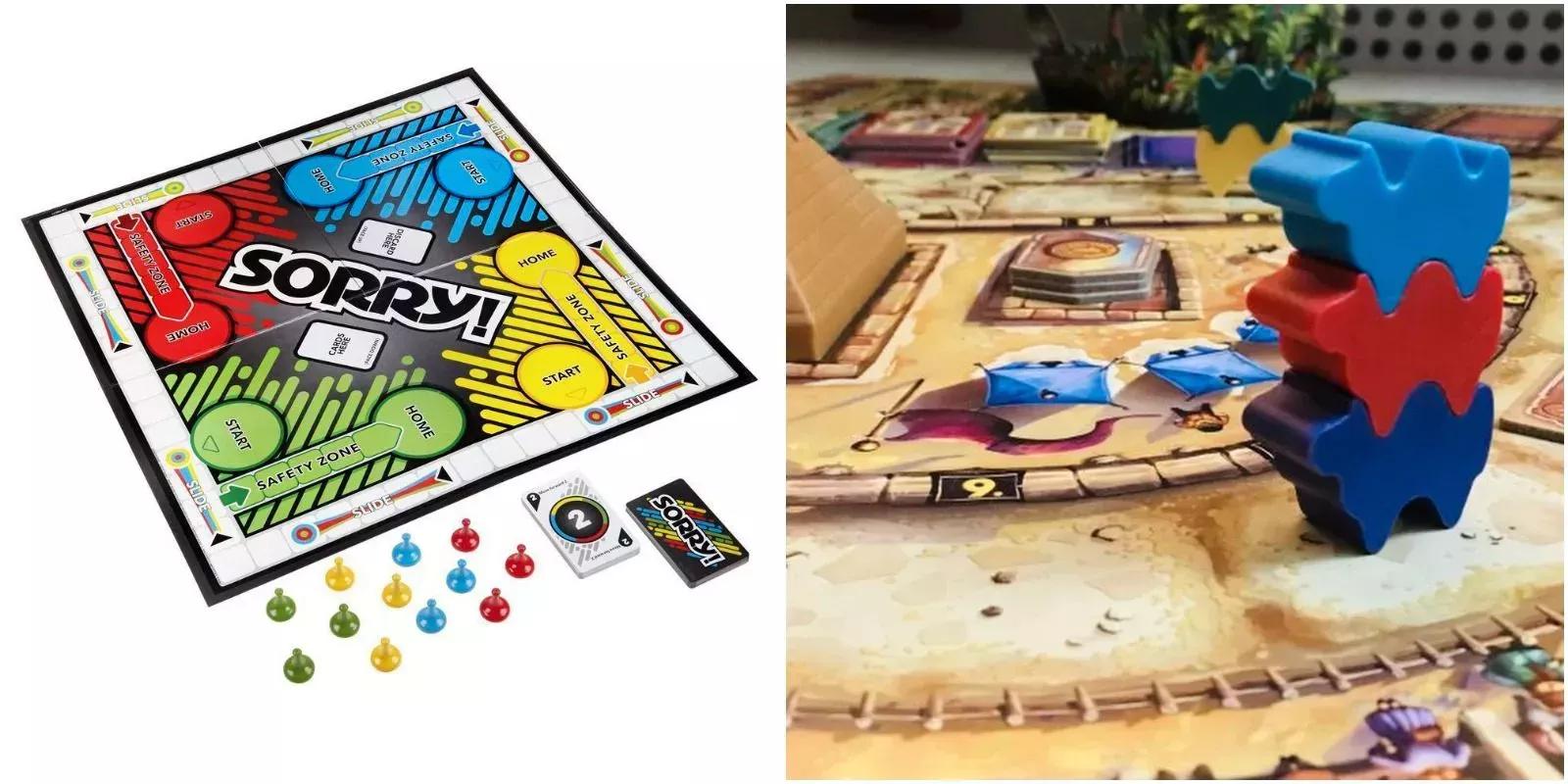 Sorry es uno de los juegos más conocidos de todos los tiempos. En el juego, los jugadores intentan llevar a sus peones hasta el final sacando cartas al azar y, generalmente, esperando lo mejor. El juego depende mucho de la suerte de la carta sacada y del número que tenga la carta. Camel Up es un juego moderno que también hace mucho hincapié en la suerte, pero en lugar de que los jugadores tengan peones que controlan, presenta camellos que corren por el tablero y los jugadores pueden elegir apostar por cualquiera de ellos que deseen.