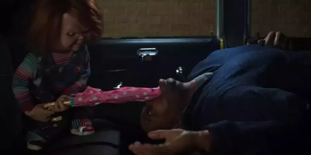 Caroline y Chucky repasan una lista de asesinatos en el asiento trasero del taxi, lo que tiene al conductor en alerta máxima. Chucky inevitablemente se cansa tanto del conductor que decide matarlo por las molestias causadas. Chucky decide utilizar un paraguas en una de las formas más horripilantes imaginables. Él empuja el paraguas en la garganta del conductor y una vez que está completamente dentro, lo abre, lo que hace que el paraguas se abra dentro del cuerpo del conductor. Este asesinato puede ser ridículo, pero es bastante espeluznante de ver.