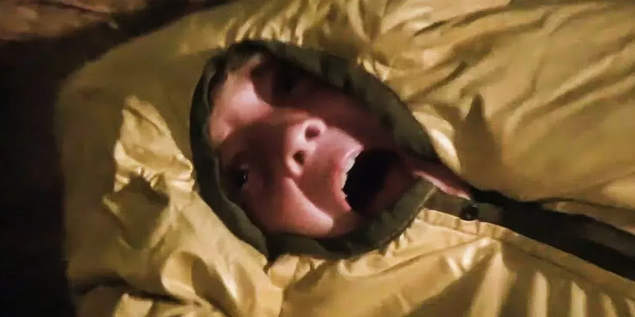 Sin embargo, la más extraña de todas es la de una víctima desprevenida envuelta en un saco de dormir. Este campista intenta huir de un salto, pero el oso mutante lo lanza por los aires. El impacto de este ataque deja plumas del saco de dormir por todas partes, pero es aún más chocante ver la velocidad a la que esta persona vuela por el aire.