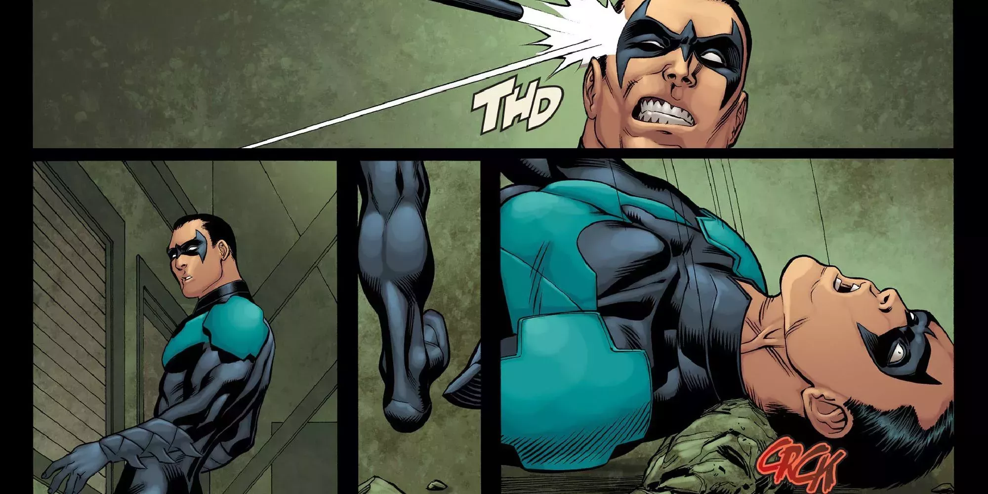 Damian Wayne lanza un palo por frustración, haciendo que Nightwing caiga hacia atrás y se golpee el cuello con una roca, muriendo al instante. Batman lo hace sobre sí mismo, diciendo que se siente abandonado de nuevo, y luego elige el cadáver de Dick sobre su hijo biológico, dejando a Damian en Arkham.