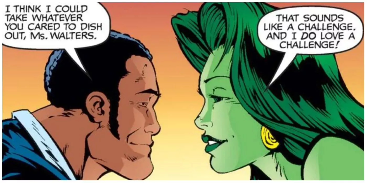 Luke Cage y She-Hulk tenían una relación diferente a cualquier otra. Los dos se unieron por una estúpida apuesta que se convirtió en un romance. Durante la primera cita de la pareja, Cage ayudó a She-Hulk a derrotar al Hombre Absorbente y a Titania con relativa facilidad.