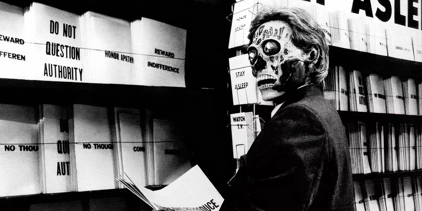 Ambientada en un futuro cercano, They Live sigue a un vagabundo llamado John Nada (Roddy Piper) que se ha quedado sin hogar en Los Ángeles y busca trabajo. Nada está atrapado en el limbo y no sabe qué dirección tomar, cuando ve que un pirata informático ha tomado el control de la televisión. Un predicador local le regala unas gafas de sol especiales y se da cuenta de que los medios de comunicación, invadidos por alienígenas, están obligando a todo el mundo a consumir y conformarse. Nada huye de estos alienígenas hostiles mientras intenta convencer a los demás de que son reales.