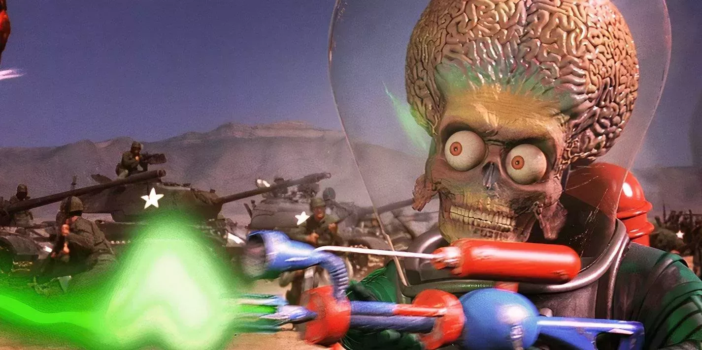 Con un director como Tim Burton al timón, no es de extrañar que haya muchos elementos cómicos y extravagantes en Mars Attacks, de 1996 . Por ejemplo, la cabeza de Sarah Jessica Parker se transpone al cuerpo de un chihuahua, vacas en llamas corren por la carretera y la banda sonora está llena de ruidos alienígenas retro creados por un theremín (además de una escena memorable en la que aparece el cantante Tom Jones). Los alienígenas, por su parte, parecen personajes de dibujos animados con sus monos de lentejuelas, pistolas de rayos de neón y diálogos indescifrables. Todo esto contrasta con las secuencias despiadadas y brutales de la película. Mars Attacks! ofrece el mismo tipo de terror de ciencia ficción que Killer Klowns From Outer Space. Es deliberadamente campy y cursi, sirviendo como carta de amor al tipo de encantadoras películas de terror de serie B que Elvira o Svengolie habrían cubierto en sus mejores tiempos.