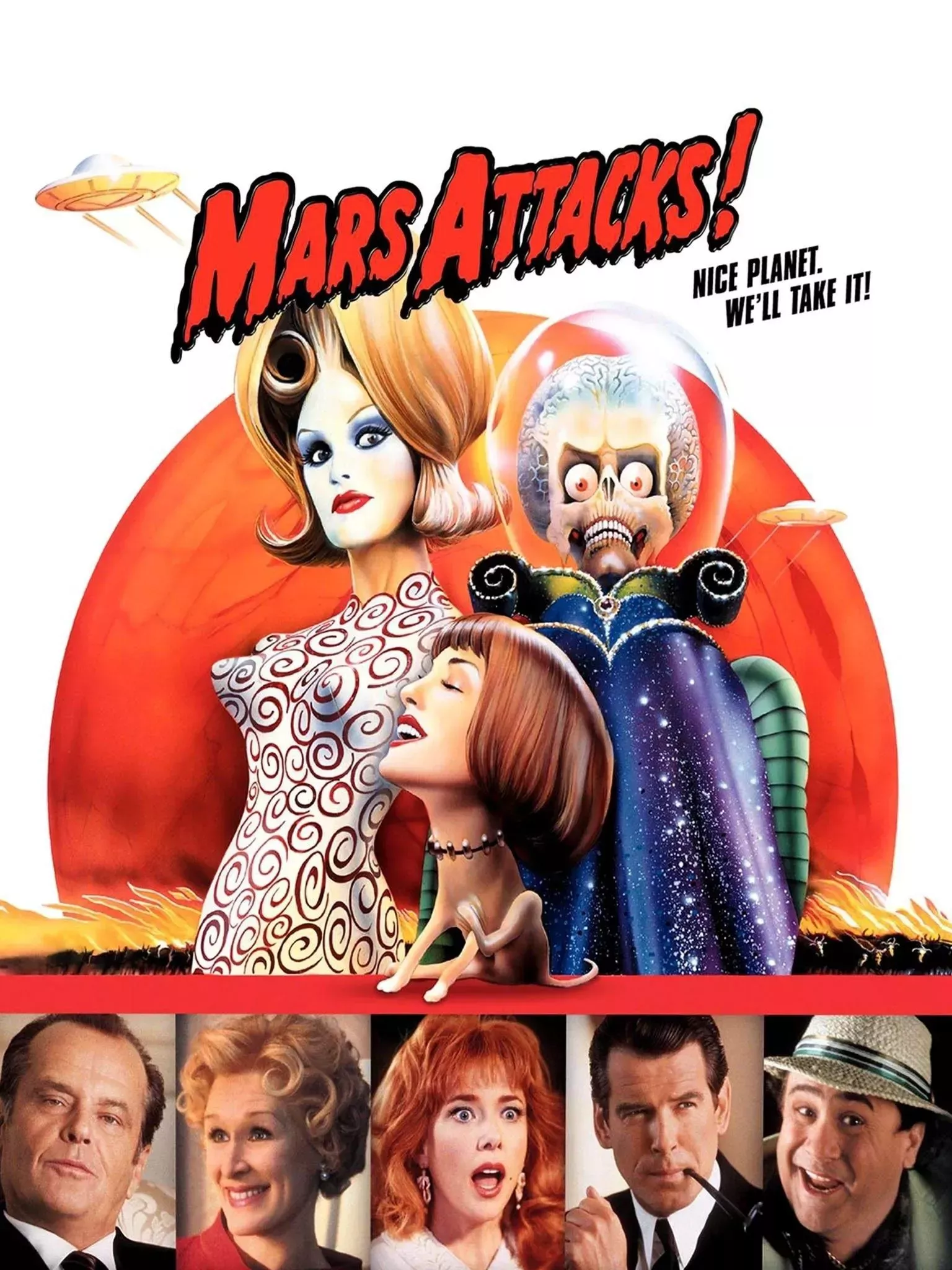 Las invasiones alienígenas adoptan muchas formas en el cine. En el caso de Mars Attacks, la invasión es una mezcla única de siniestro y absurdo. Los marcianos aterrizan en las afueras de Pahrump, Nevada, y todos los habitantes del pueblo entran en pánico. Al principio, la fuerza militar intenta saludar a los marcianos para ver si vienen en son de paz. Sin embargo, inmediatamente queda claro que no es así cuando el marciano dispara a una pacífica paloma desde el aire. Lo que sigue es un ataque despiadado contra todos los soldados y civiles.