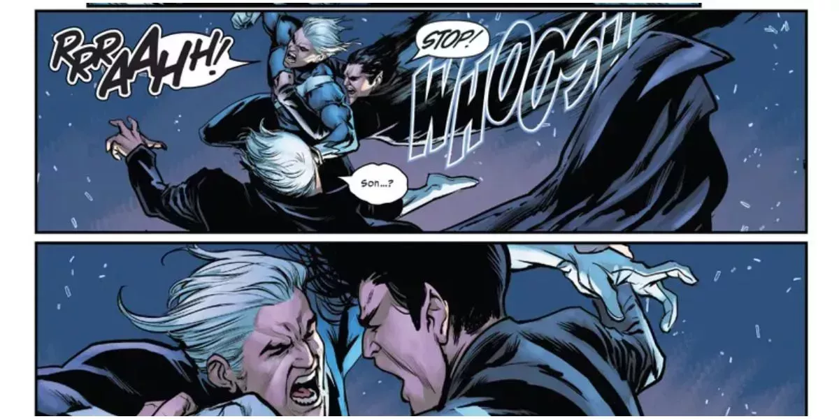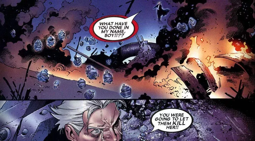 Quicksilver utilizaría su supervelocidad para vencer fácilmente a Magneto, derribando al hombre que consideraba su padre para proteger a Bruja Escarlata.