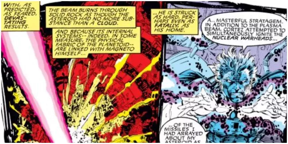 Apuntando al Asteroide M con un rayo de plasma espacial, se prepararon para destruir la base de Magneto. El villano permitió a los X-Men evacuar antes de que el arma se disparara, destruyendo su base y matando a la mayoría de sus Acólitos, creyéndose muerto durante un tiempo tras el ataque.