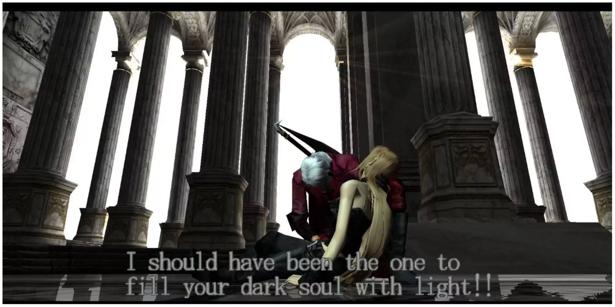 Durante esta triste escena, el protagonista, Dante, se acerca a su compañera más cercana, Trish, después de que ésta haya muerto. Tras llorarla durante unos segundos, grita: "¡DeberÃa haber sido yo quien llenara de luz tu oscura alma!" Sin embargo, la voz de Dante se quiebra cuando dice la última parte de la frase, lo que hace que esta escena sea hilarante en lugar de emotiva.