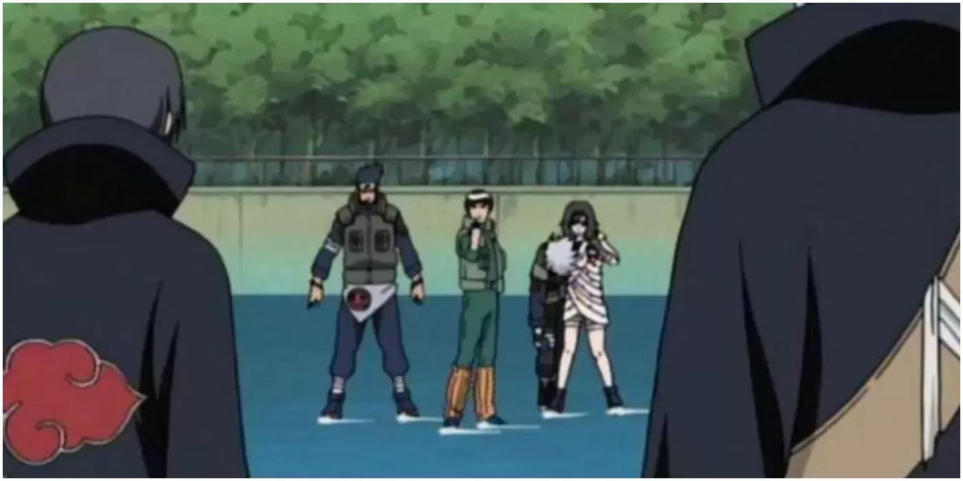 Para cumplir la gran misión de los Akatsuki, Kisame e Itachi atacaron la Hoja. Teniendo en cuenta los antecedentes de este último como miembro de los Anbu, evitar los guardias sensoriales que rodean la frontera era una cuestión insignificante. Esto dio lugar a un brutal ajuste de cuentas entre los dos miembros de Akatsuki y algunos de los mejores jonin de Konoha.