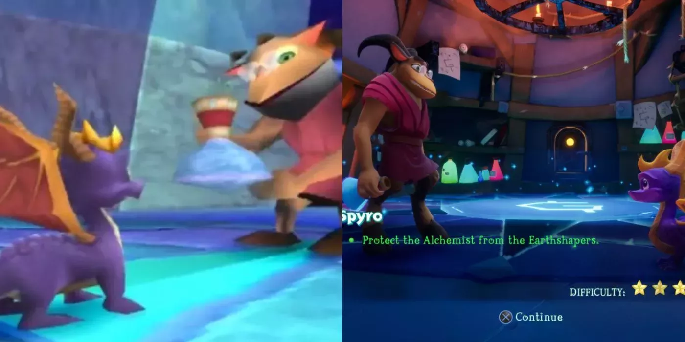 El objetivo es sencillo: proteger al alquimista de los Earthshapers mientras reparte su poción. El problema, sin embargo, es que su IA parece intencionadamente incompetente, ya que se topa con todos los enemigos del camino. Esta molestia persiste en el remake de Ripto's Rage de la trilogía Spyro Reignited.