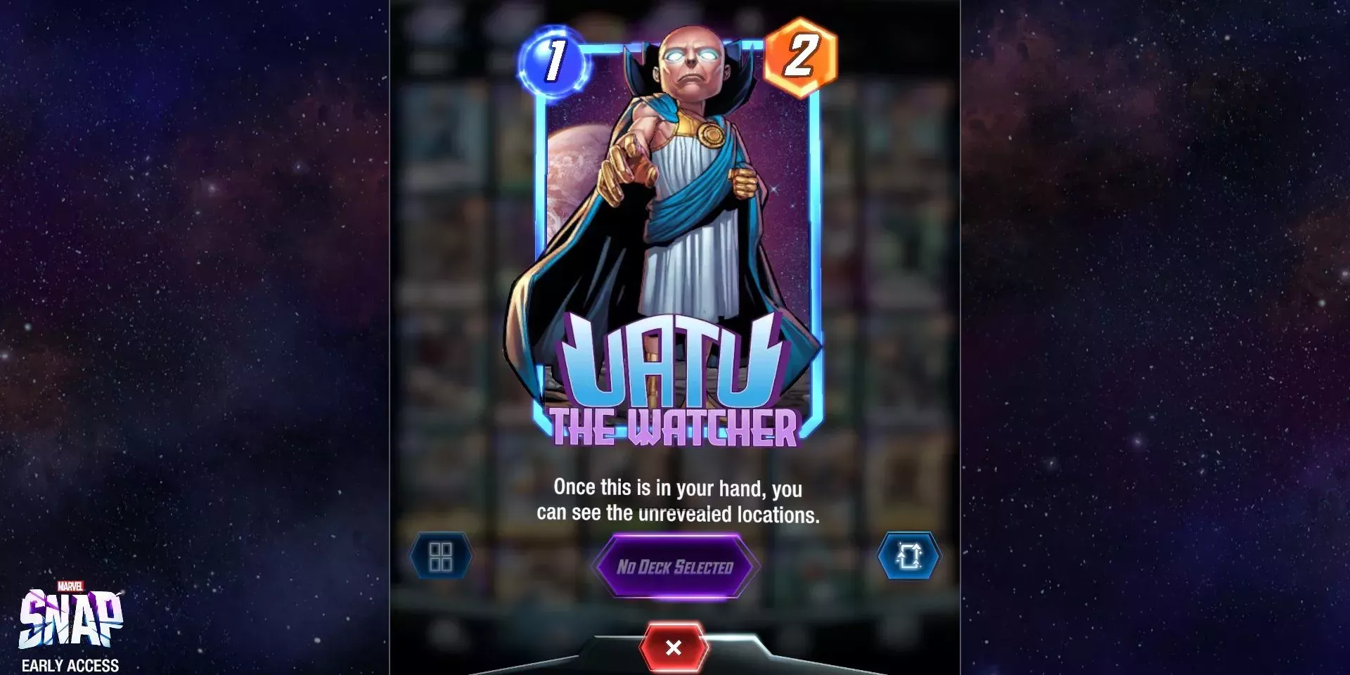 Uatu, también conocido como El Vigilante, parece a primera vista una carta de corte, ya que su perspicacia permite a los jugadores ver las propiedades de los lugares no revelados. Sin embargo, esto no es un gran problema en Marvel Snap. Si Uatu aparece en la mano del jugador en el primer turno, el usuario sabrá de antemano las otras dos localizaciones, pero no hay garantÃa de que aparezca siquiera en ese primer turno.