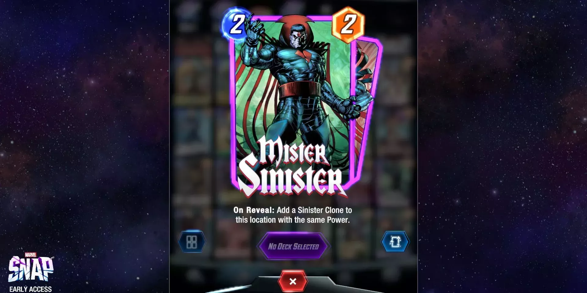 El concepto de duplicación de una carta es una perspectiva emocionante en teorÃa, pero cuando Mister Sinister activa su habilidad Al Revelar, puede ser bastante decepcionante sin un apoyo considerable. Mister Sinister introduciendo un Clon Siniestro puede ser efectivo para tratar de llenar rápidamente una ubicación en aras de una pericia o un impulso. Sin embargo, su potencia no es lo suficientemente buena sin apoyo.