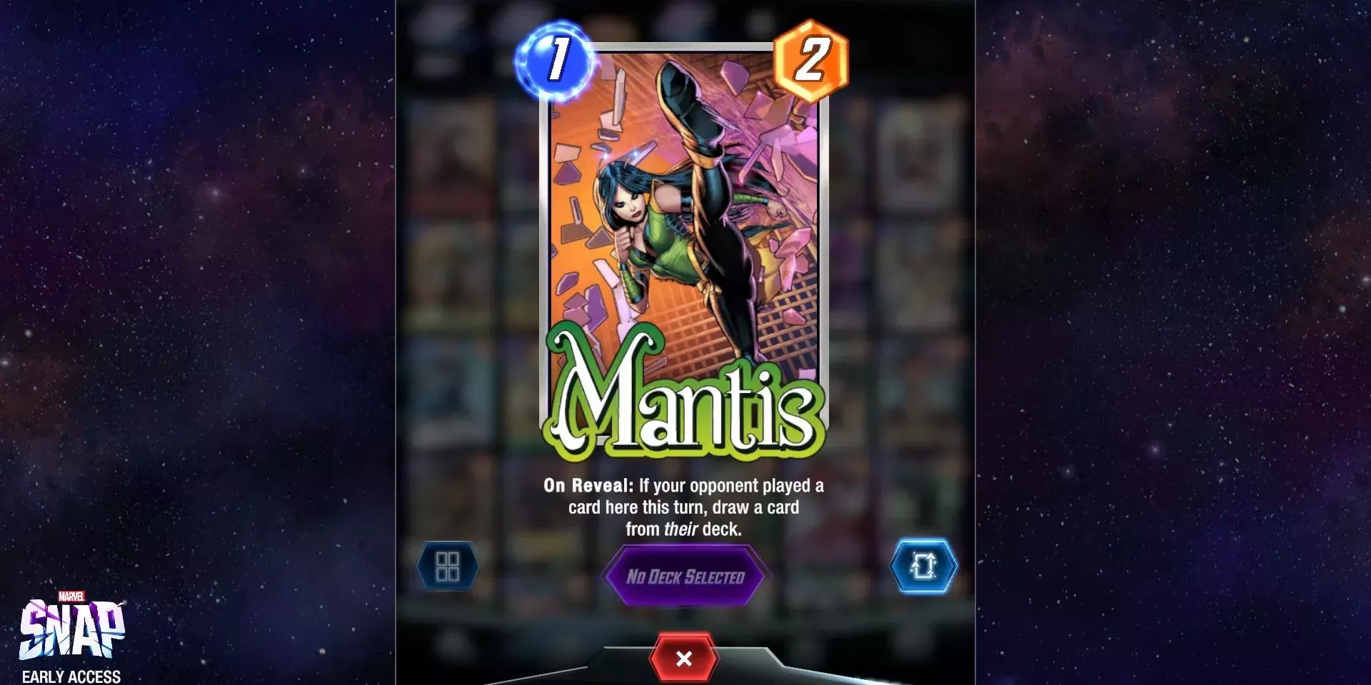 De todos los personajes delGrupo 1 de Guardianes de la Galaxia cuyas habilidades se basan en adivinar la elección del oponente, la carta de Mantis es la más decepcionante. Rocket es una carta de 1 coste que aportará +2 de poder, Star-Lord una de 2 costes con 3 de poder extra y Gamora es un equivalente de última hora que puede aportar 12 de poder.