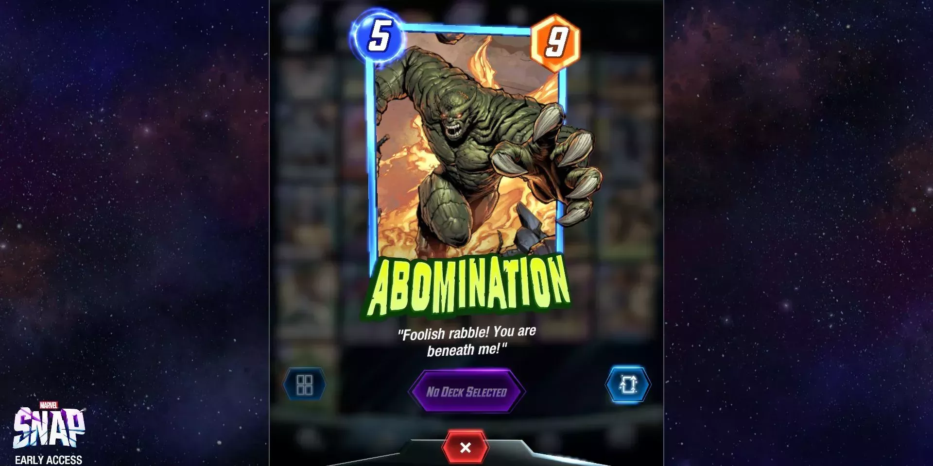 Hay mejores caminos que jugar Abominación en Marvel Snap, con combinaciones de cartas más baratas para el mismo total de EnergÃa que ofrecen una mejor distribución en el tablero. La Abominación podrÃa seguir utilizándose en el último turno, pero en ese momento, el jugador deberÃa tener a Hulk en su mazo.