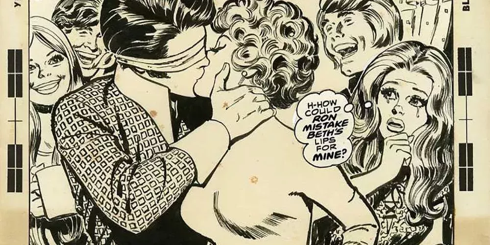 La portada de Jay Scott Pike para el último número de Girls' Love Stories tiene todas las caracterÃsticas de los cómics románticos de la Edad de Bronce. Un hombre con los ojos vendados besa a una mujer mientras otra llora detrás de ellos. Además de la mujer que llora, una multitud se rÃe detrás de la pareja que se besa. No es una escena agradable.
