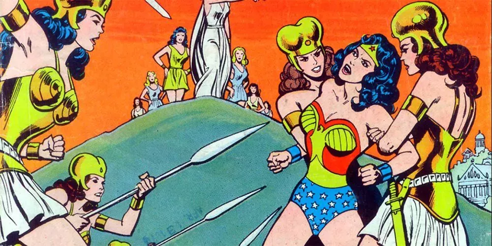 La Edad de Bronce tuvo su cuota de material sugerente. Entre los retratos de heroÃnas esclavizadas o aferradas a los hombres, destaca la portada de Ernie Chan para Wonder Woman #224 . La Mujer Maravilla es sujetada por amazonas cuyos cascos dejan mucho a la imaginación del lector.