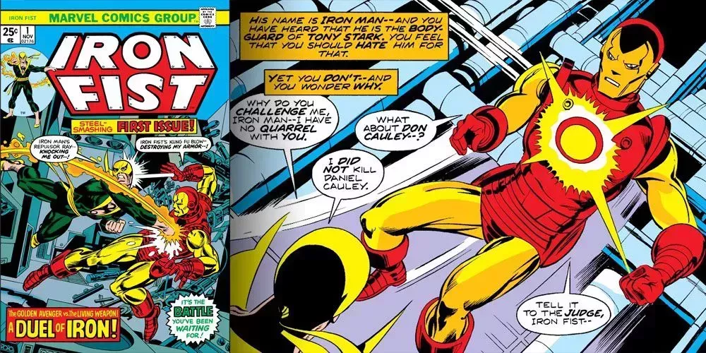 Puño de Hierro se enfrenta a Iron Man en Iron Fist #1, con portada de Gil Kane. La pelea parece un poco unilateral, ya que Tony Stark tiene un montón de artilugios en su armadura mientras que Puño de Hierro es un artista marcial con un supergolpe que no puede hacer mucho contra el Vengador Blindado volador. Según la portada, la única razón por la que parecen luchar es que sólo puede haber un ser un superhéroe de hierro.